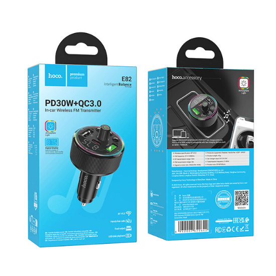 The Hoco E82 In-Car Wireless FM Transmitter is a multifunctional device designed to enhance your driving experience by combining wireless audio streaming, hands-free calling, and fast charging capabilities. With its sleek design and advanced features, it seamlessly integrates into your vehicle’s interior.